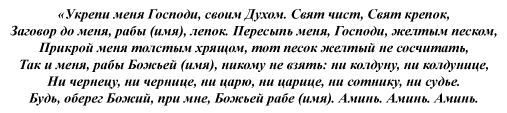 «Господь всемогущий, светило дневное мой оберег силою одарило, дай и светилу ночному сделать это в полной мере. Помоги мне и дай мне мощь Алтыря-Богатыря, Георгия Победоносца и Ильи Муромца, чтобы смог я быть непобедимым и сила бы была во мне немереная. Жду твоего благословения и твоего позволения быть мне победителем! Аминь! Аминь! Аминь!».