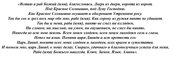«Господь наш, Милостивый! Призываю тебя, чтобы помог ты отвернуть от меня злые силы, злые языки. Чтобы никакой краг и завистник не мог выпить из меня энергию. Чтобы обошли они меня все стороной, а к тебе пришли, повиниться. Сам грешен, но прошу защиты у тебя милостивый. Аминь».