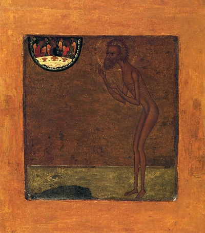 Избрав необыкновенным местом для своего подвижничества многолюдный град, блаженный избрал и необыкновенный путь ко граду Небесному — юродство Христа ради. В продолжение всей своей подвижнической жизни он всегда имел пред своими глазами страшный день воздаяния Господня и не носил никакого одеяния, но пожелал быть всегда нагим, как бы уже предстоящим нели цемерному судилищу Сына Божия. Ни зимою, ни летом, никогда не имел он у себя крова, ни даже какого-либо малого вертепа, то есть пещеры, но страдал от мороза и от палящего зноя. Как первозданный Адам прежде своего преступления, наг ходил он и не стыдился, свыше украшенный душевной кра сотой, не радея о своем теле и вменяя нестер пимый мороз как бы в некую теп лоту, ибо тело праведника, согреваемое благодатью Божией, сильнее было и стужи, и огня.